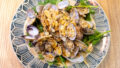 3. 片栗粉をつけた骨つき鶏モモ肉を中火で約10分ほど揚げる。 ボウルに取り出し、ミキサーで回した柿の種と小葱、レモン汁を入れよく混ぜ合わせる。 皿にもりつける。